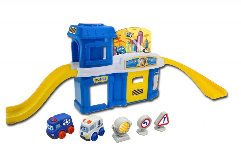 • Setul include 11 piese de joc: 2 masinute, semne circulatie, rampe, piese pentru asamblat sectia de politie.