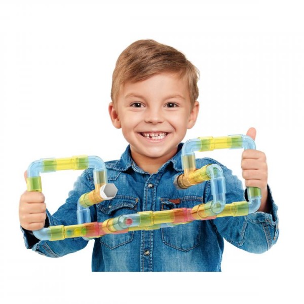 Un joc original de constructie alcatuit din 36 de tuburi care pot fi unite pentru a crea forme si trasee prin care cele 6 bile isi gasesc drumul.