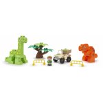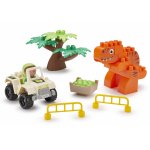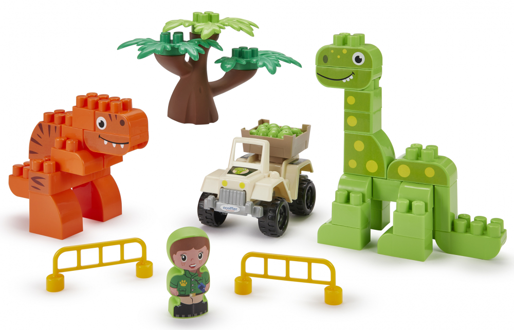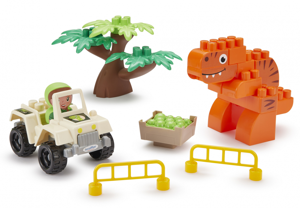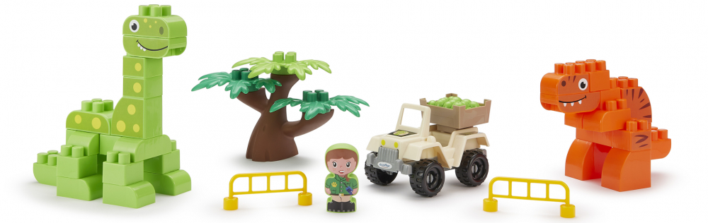 Pachetul include 2 dinozauri consturibili din cuburi, un copac, un vehicul, un personaj si doua bariere.