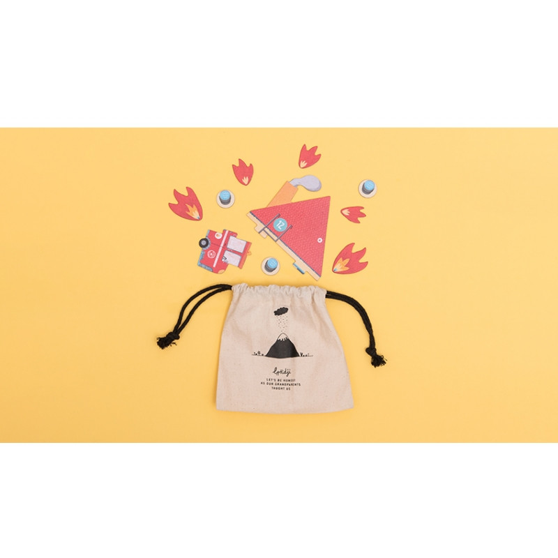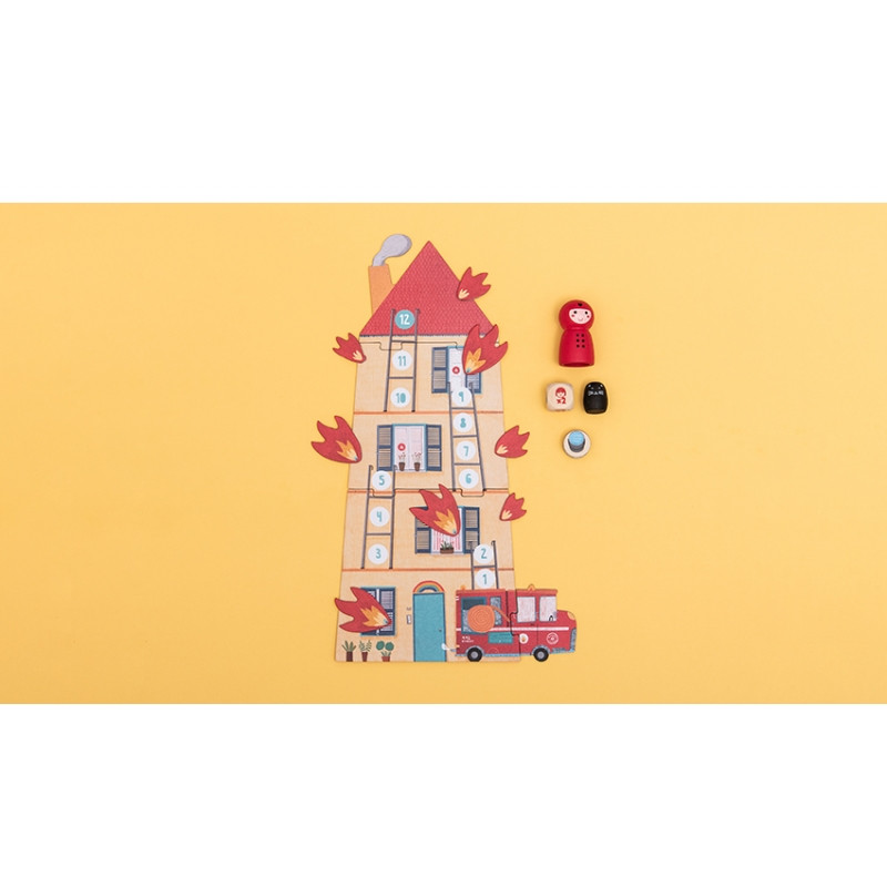Conține tabla de joc puzzle (26 x 47 cm), figurina pompier, figurina pisica, 9 piese foc, 12 token-uri numere, zar din lemn.