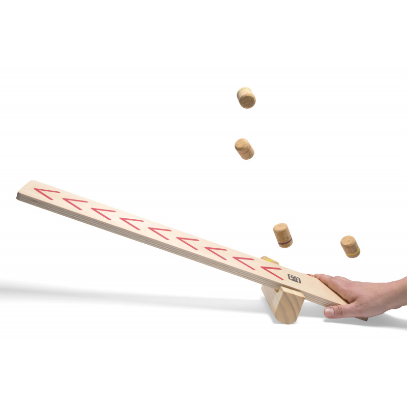 Dimensiuni: placa lansatoare: 65 x 9 x 2 cm; figurine pluta: 5 x 3 cm; plasa: 29 x 11 cm
