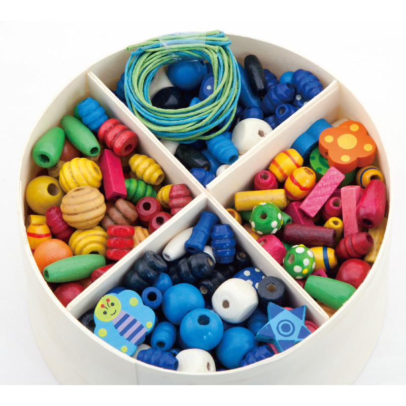 Include 8 sireturi si peste 600 de bucati de margele colorate din lemn de diferite forme. Jucarie educativa din lemn, Montessori.