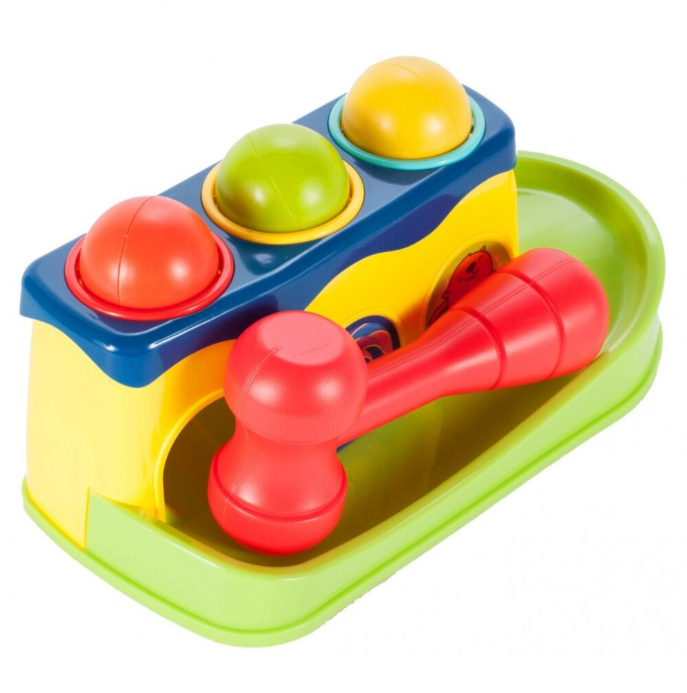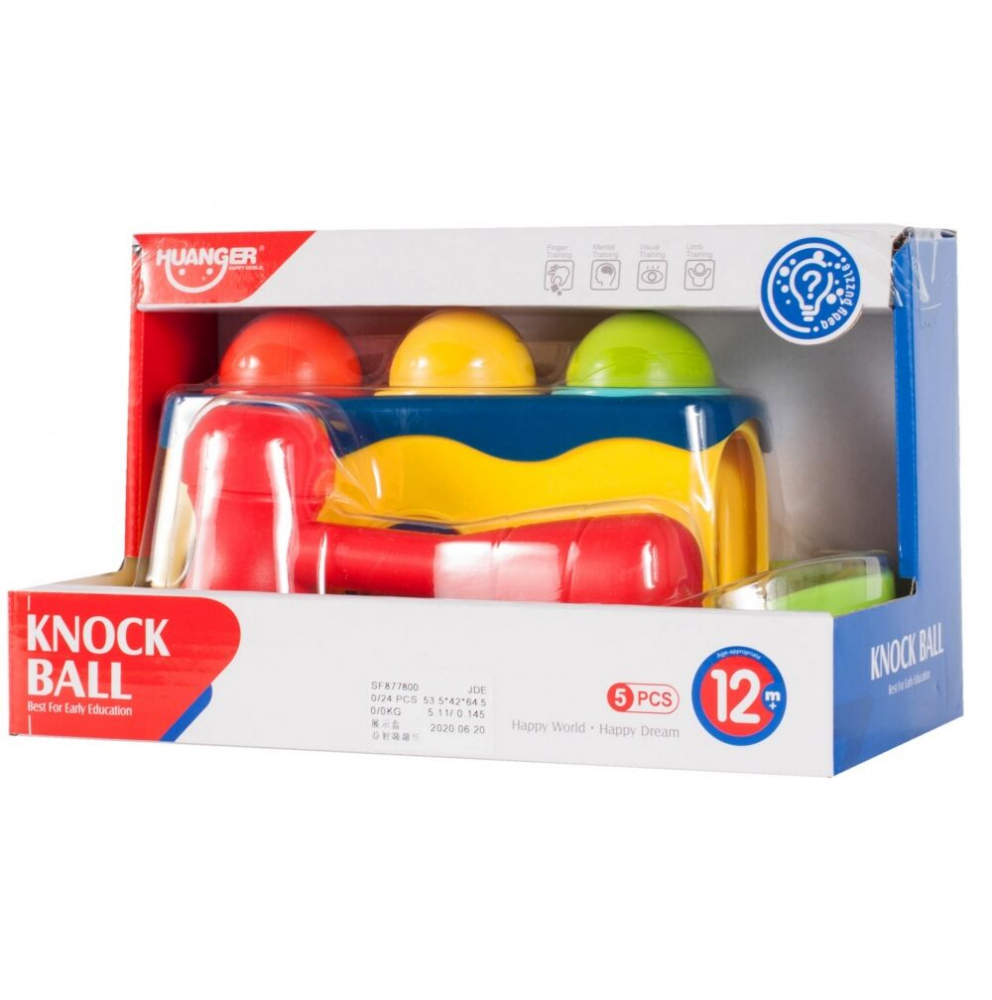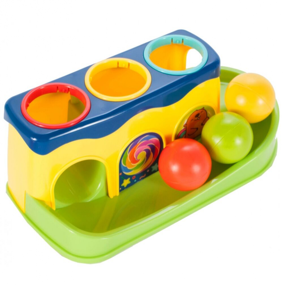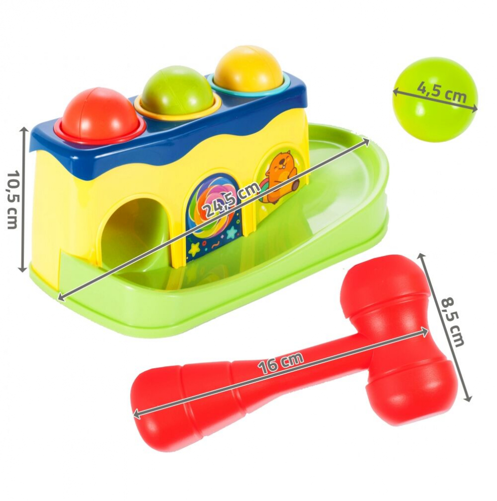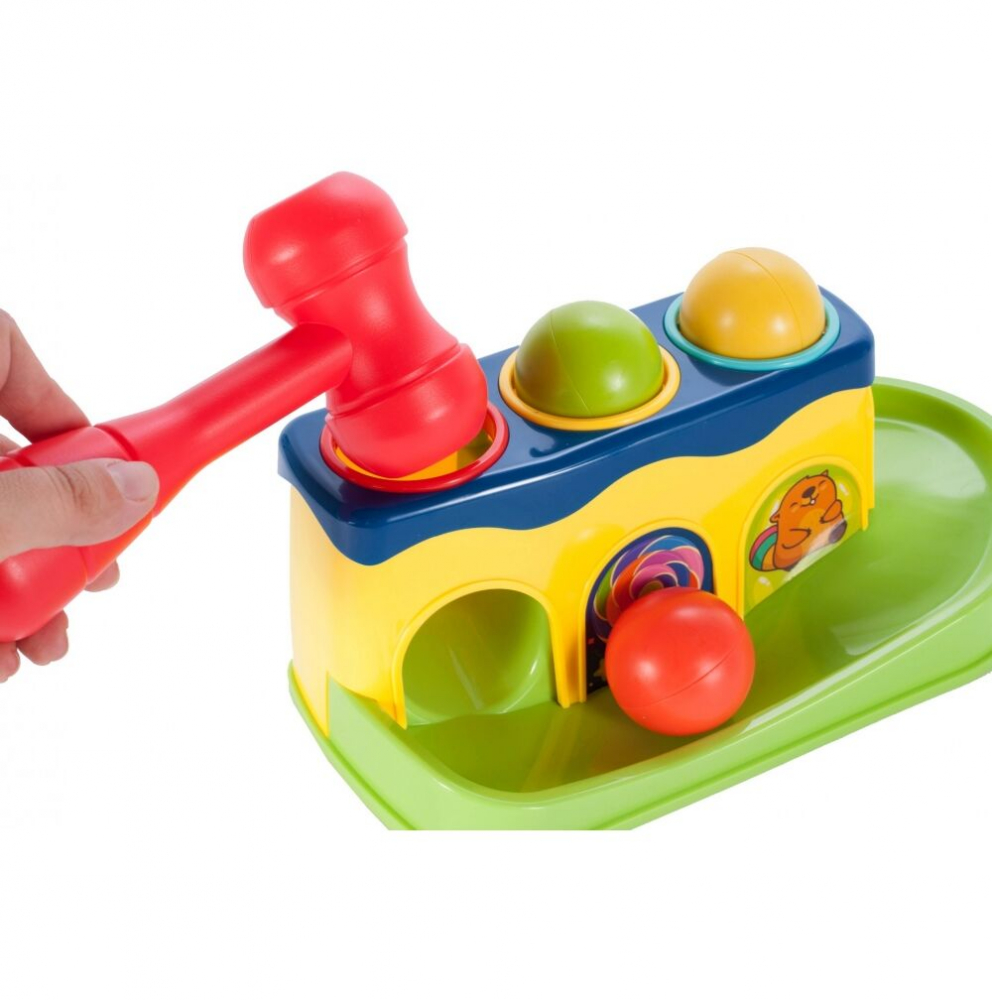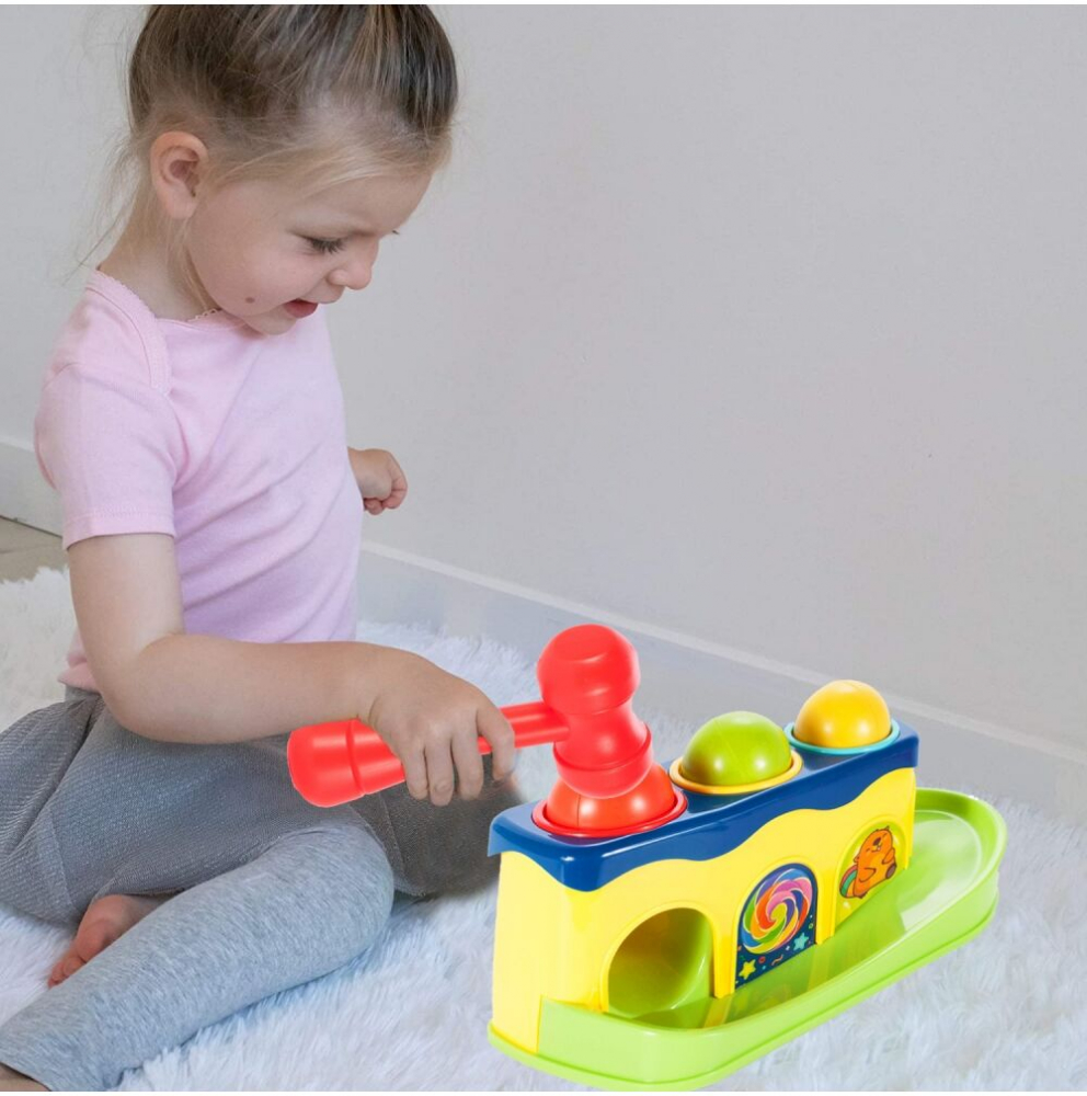 3 mingi care zdrăngănesc în culori diferite, care, lovite cu un ciocan, vor distra copilul cu diverse efecte sonore, iar când vor cădea în jgheab, îl vor încuraja pe copilul tău să continue să se joace.