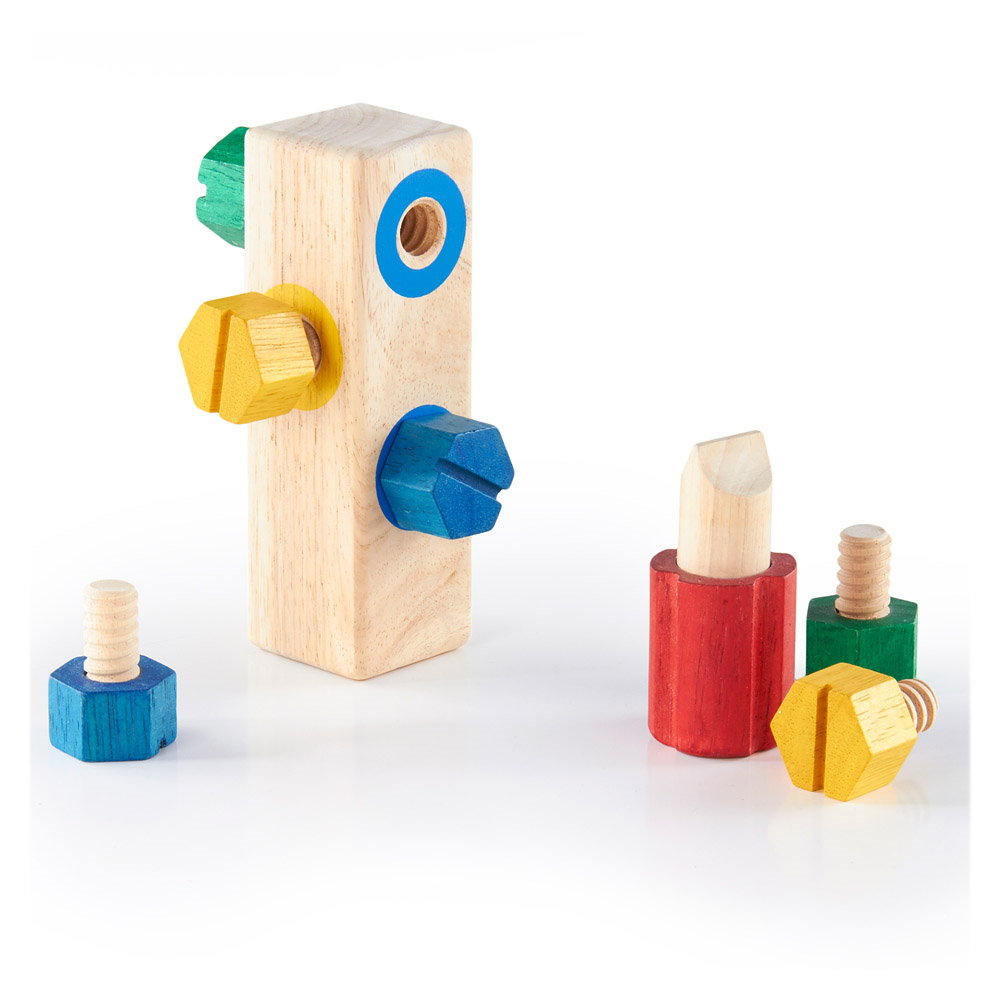 - Setul include: un bloc din lemn, 6 suruburi colorate si 1 surubelnita.