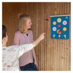Jocul contine o suprafata de joc cu fata dubla care se poate agata pe perete si 4 sageti din pene cu capete magnetice.