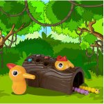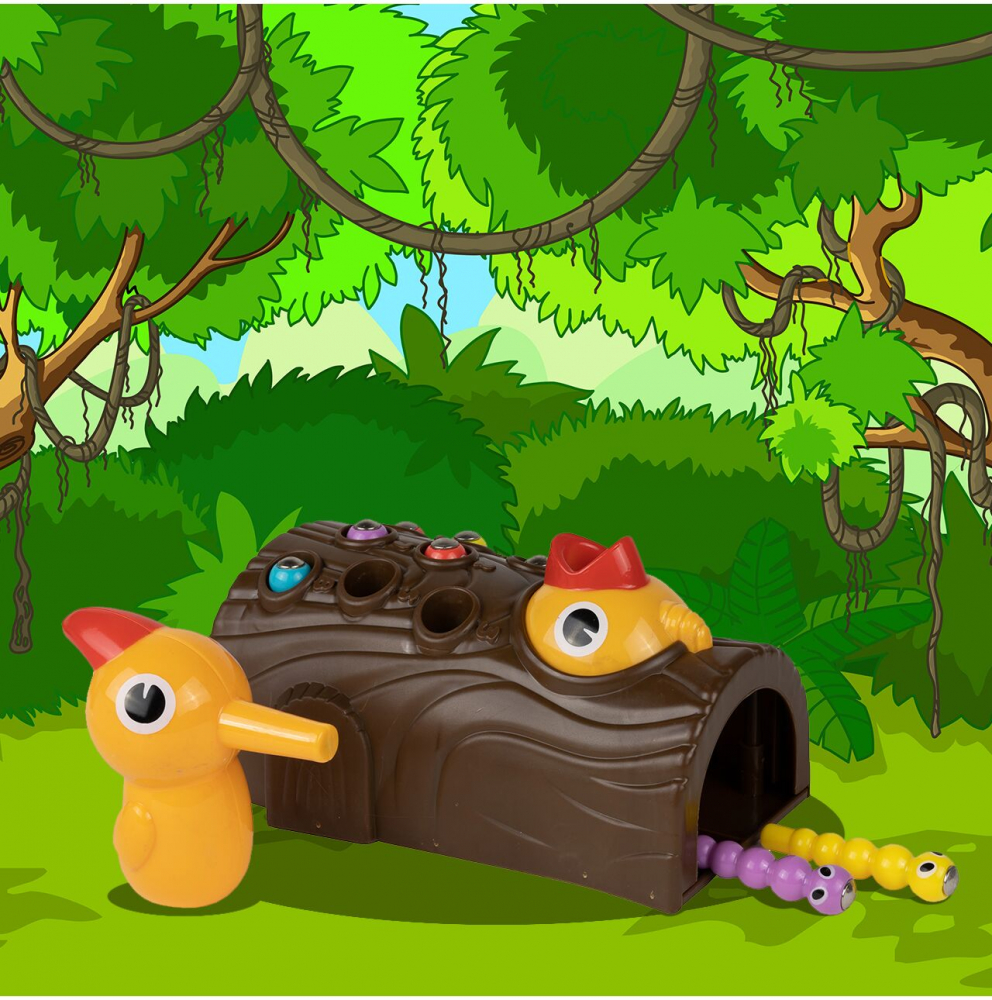 Sarcina copilului este sa scoata viermii din bustean cu ajutorul unei ciocanitori si sa ii aseze cu precizie in ciocul puiului.