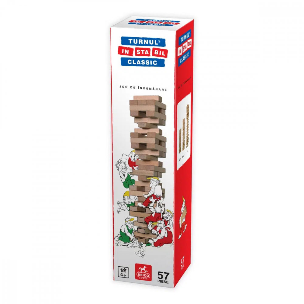 Construiți împreună turnul cu ajutorul celor 57 de piese din lemn și apoi trageți pe rând, cu grijă, fiecare piesă, pentru ca turnul să nu se prăbușească. Fiecare mutare duce la schimbarea centrului de greutate și afectează echilibrul turnului, astfel că el devine tot mai instabil.