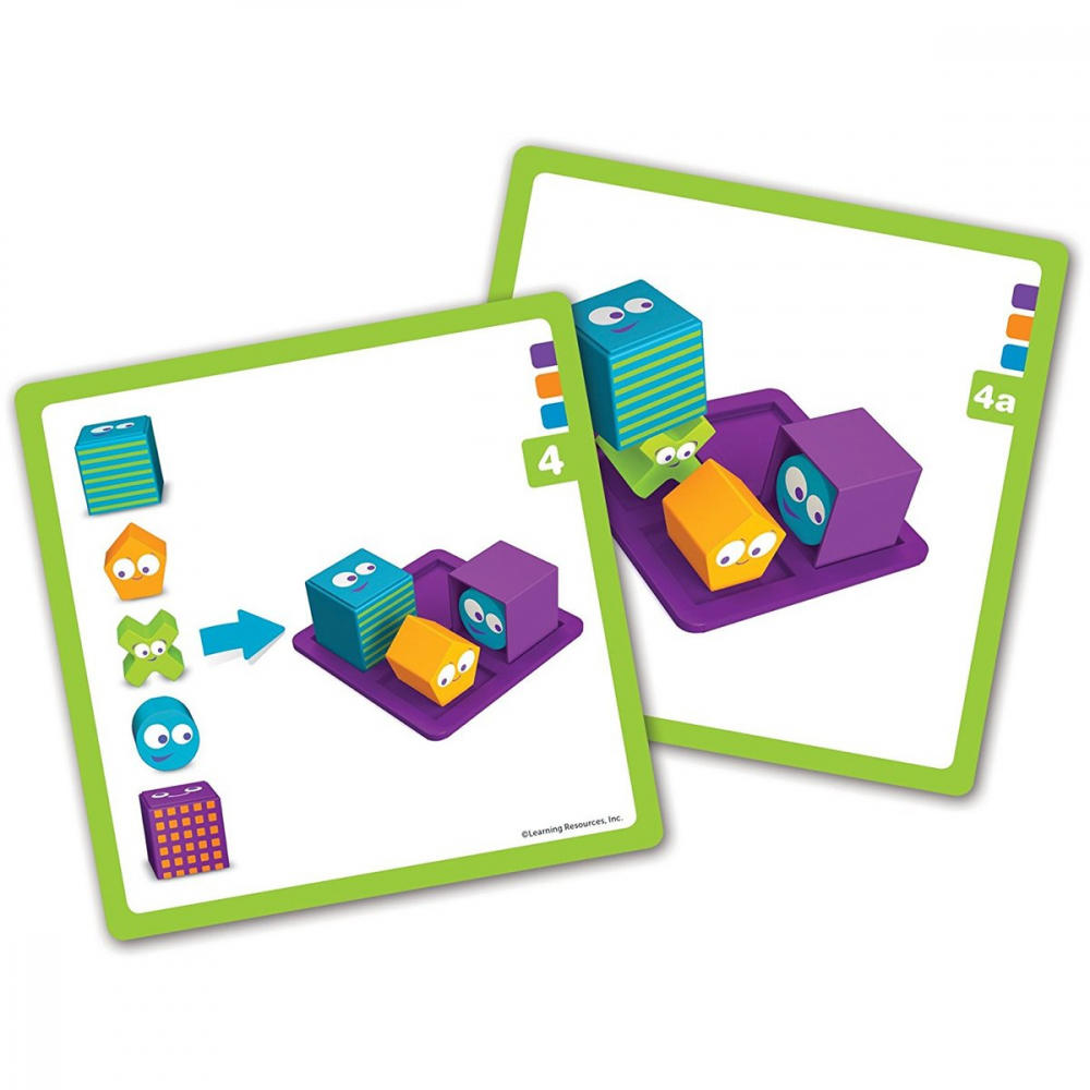 Cardurile cu imagini prezinta o multime de constructii, pe care cei mici trebuie sa le reproduca cu ajutorul formelor geometrice incluse in set.
