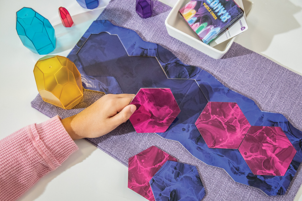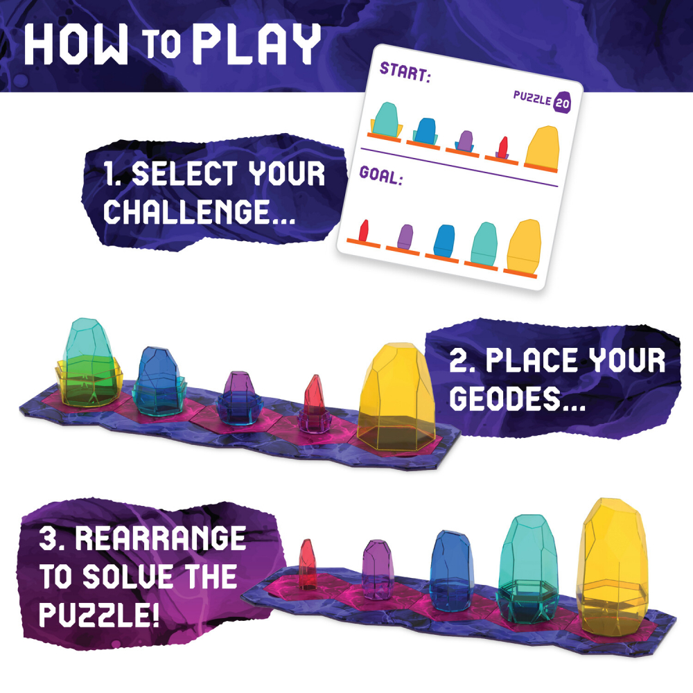 • Include 9 piese geode, 1 tabla de joc, 5 piese hexagonale pentru tabla de joc, 36 de cartonase cu puzzle-uri, instructiuni si ghid cu solutii Varsta recomandata: 8 ani+