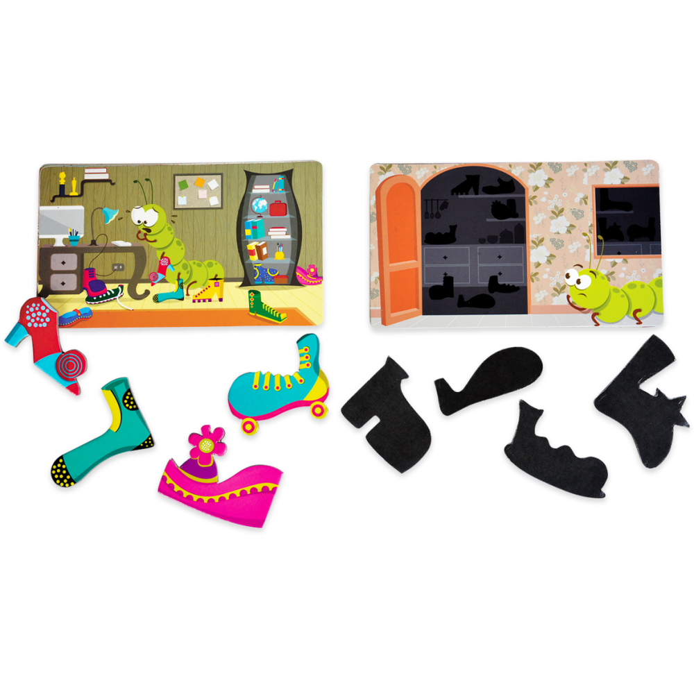 Regulament: Aranjeaza pantofii cu partea colorata in sus. Amesteca cardurile cu imagini si intoarce-le cu fata in jos in mijlocul zone de joc. Intoarce primul card si priveste-l cu atentie pentru a memora pantofiorii din imagine. Intoarce cardul la loc cu fata in jos si grabeste-te sa strangi pantofii pe care i-ai retinut. Jocul se termina cand au fost folosite toate cele 10 carduri cu imagini. Fiecare pantofior identificat corect valoreaza 1 punct. Daca ai ales un pantof care nu se afla in imagine, atunci ti se scade 1 punct. Jucatorul care are scorul cel mai mare castiga jocul. Un singur joc, mai multe variante! Poti identifica pantofiorii colorati care corespund incaperilor in care este lumina aprinsa sau poti juca varianta mai palpitanta, in care incaperile au lumina stinsa, iar tu trebuie sa gasesti umbrele pantofilor. O alta varianta de joc este aceea in care micutii isi folosesc imaginatia si creativitatea pentru a descrie in detaliu fiecare imagine in parte si fiecare pantofior sau identifica emotiile omidutei Catty.