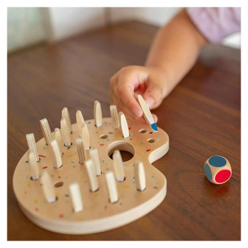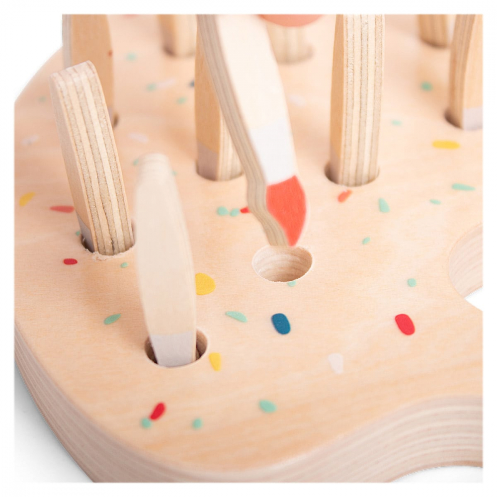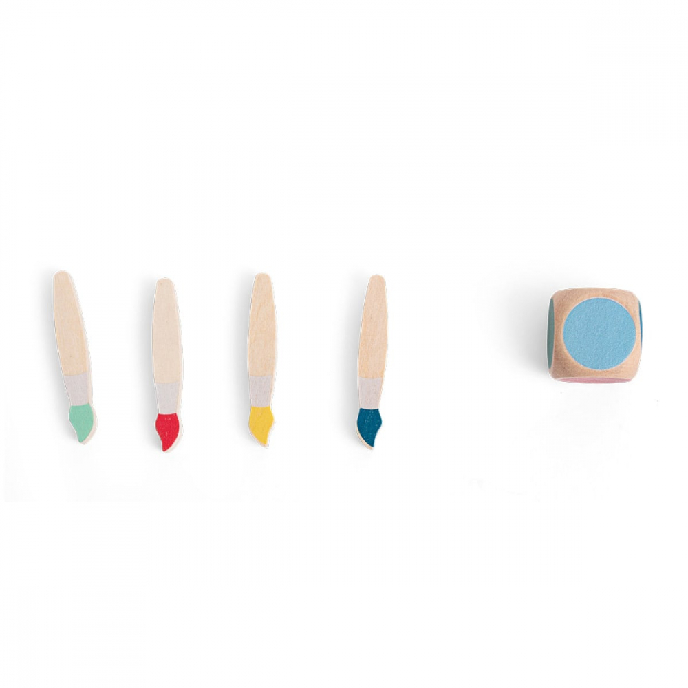 Continut: 1 baza din lemn sub forma de paleta de pictura (15 x 15 cm), 1 zar cu culori, 24 de pensule cu varfurile colorate (4 cm).