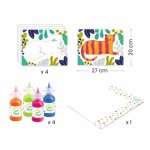 Conținut: 4 mape ilustrate cu buzunar din plastic lavabil, 4 tuburi guașă (roșu, portocaliu, albastru și verde), broșură cu instrucțiuni pas cu pas în imagini.