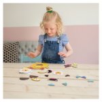 • Jocul contine: 1 mosntrulet din placaj (19x21 cm), 36 de carduri din carton (6.5 x 6.5 cm) si 24 de piese din placaj (ochi, guri, coarne).