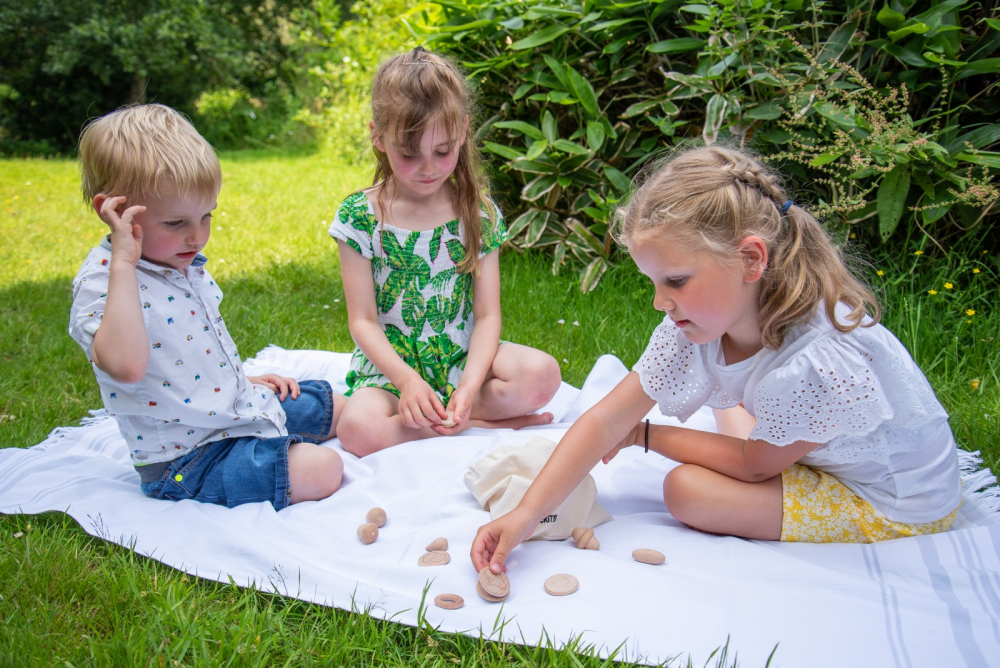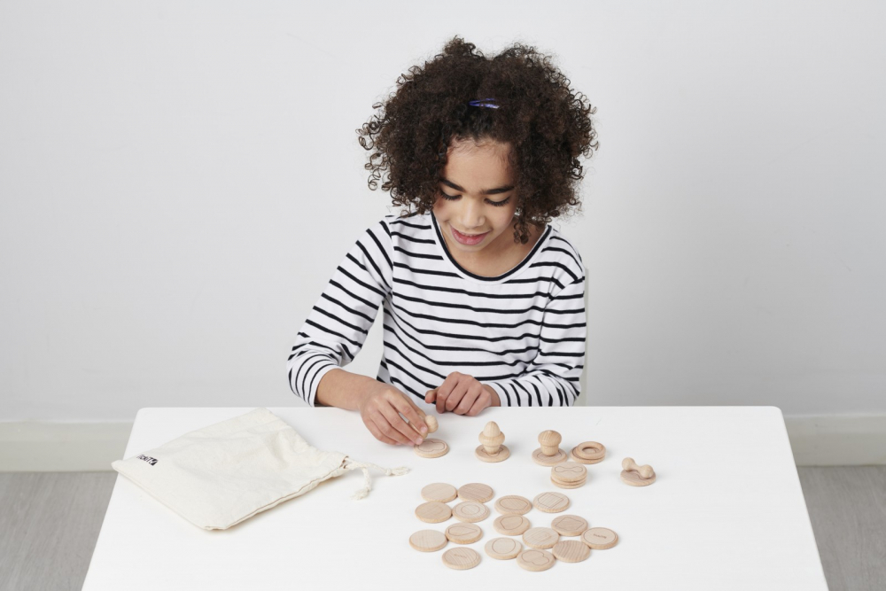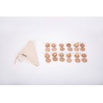 Setul conține 12 comori frumoase netede din lemn nevopsit, cu 24 de discuri potrivite, imprimate cu contururile formelor comorilor, pentru joc de atinge și potrivește și joc de memorie.