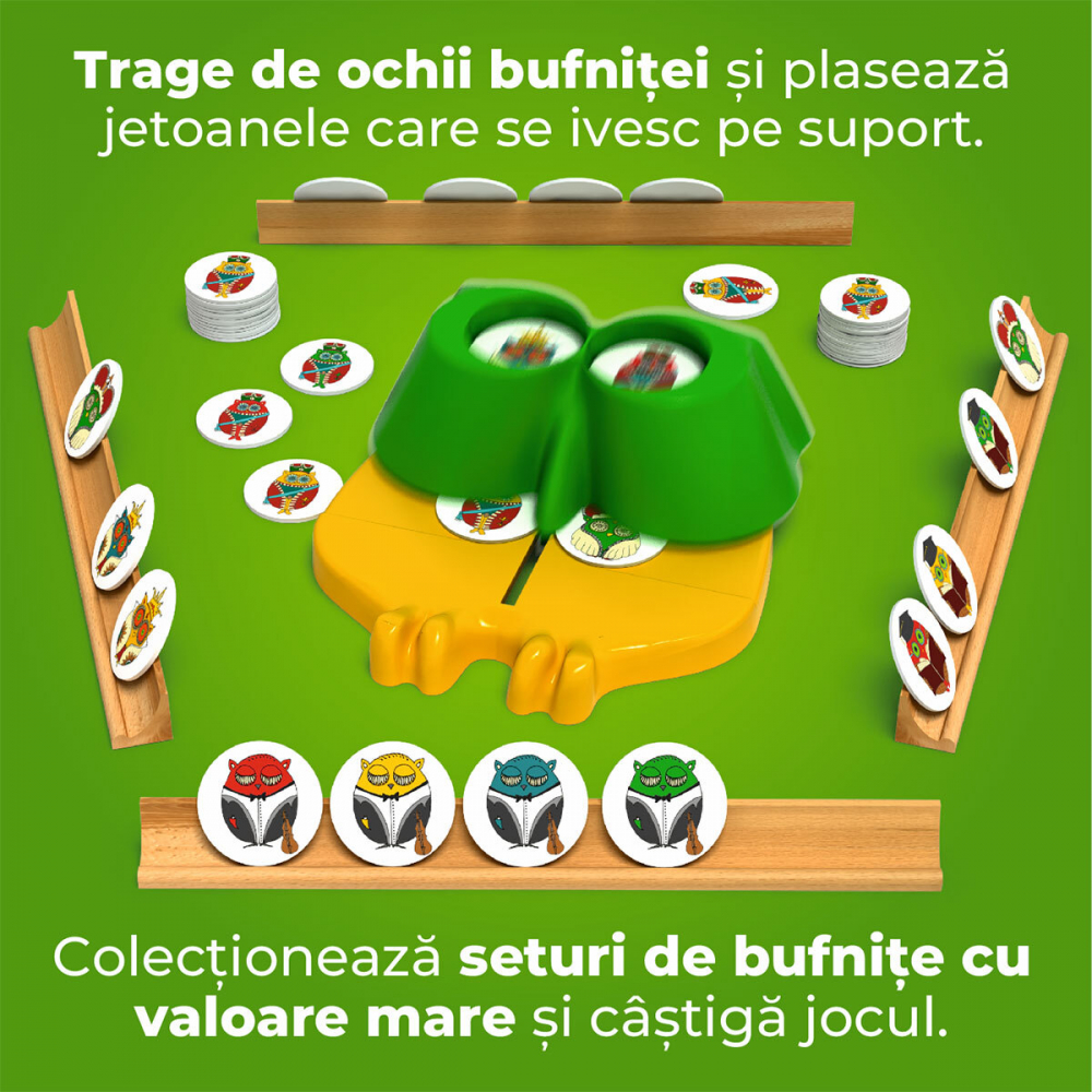 Micii curioși sunt încântați de mișcarea ochilor bufniței și așteaptă cu sufletul la gură să le apară jetoanele de care au nevoie pentru a forma seturi cu punctaj maxim.