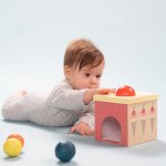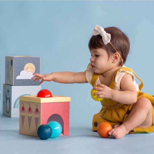 Bebelusilor le place sa se joace peekaboo dintr-un motiv! Ei isi dezvolta capacitatea de a sti ca obiectele continua sa existe chiar daca nu mai pot fi vazute. Bebelusul va scapa mingea prin orificiul din cutie si va fi surprins cand va disparea din vedere, doar pentru a reaparea magic cateva momente mai tarziu.