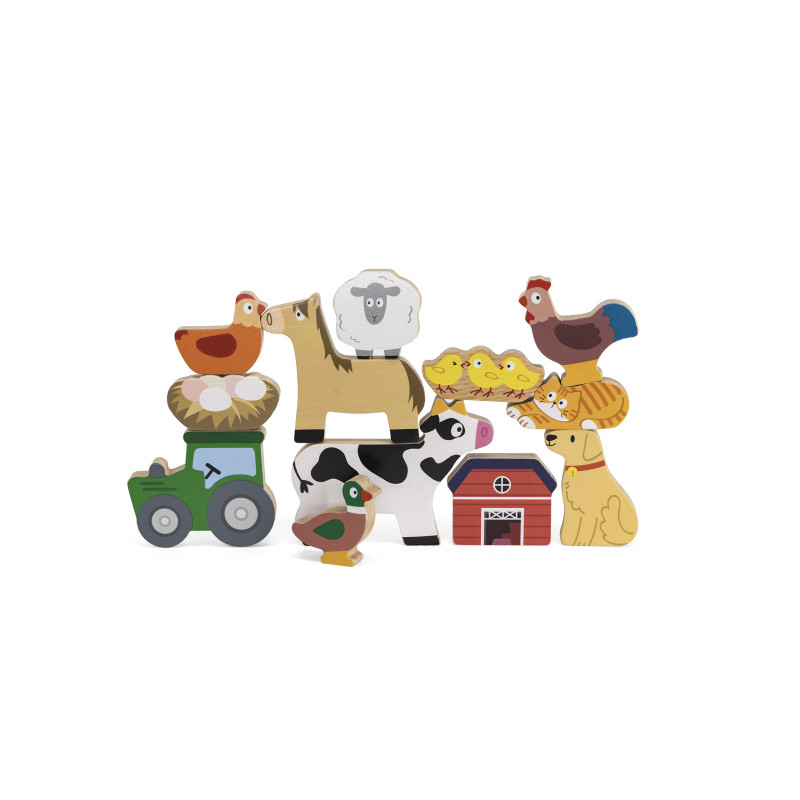 Convenabil impachetat intr-un saculet de bumbac, acest joc de stivuire din lemn, cu tematica de ferma, include 12 blocuri, perfecte pentru a construi o scena distractiva de ferma!