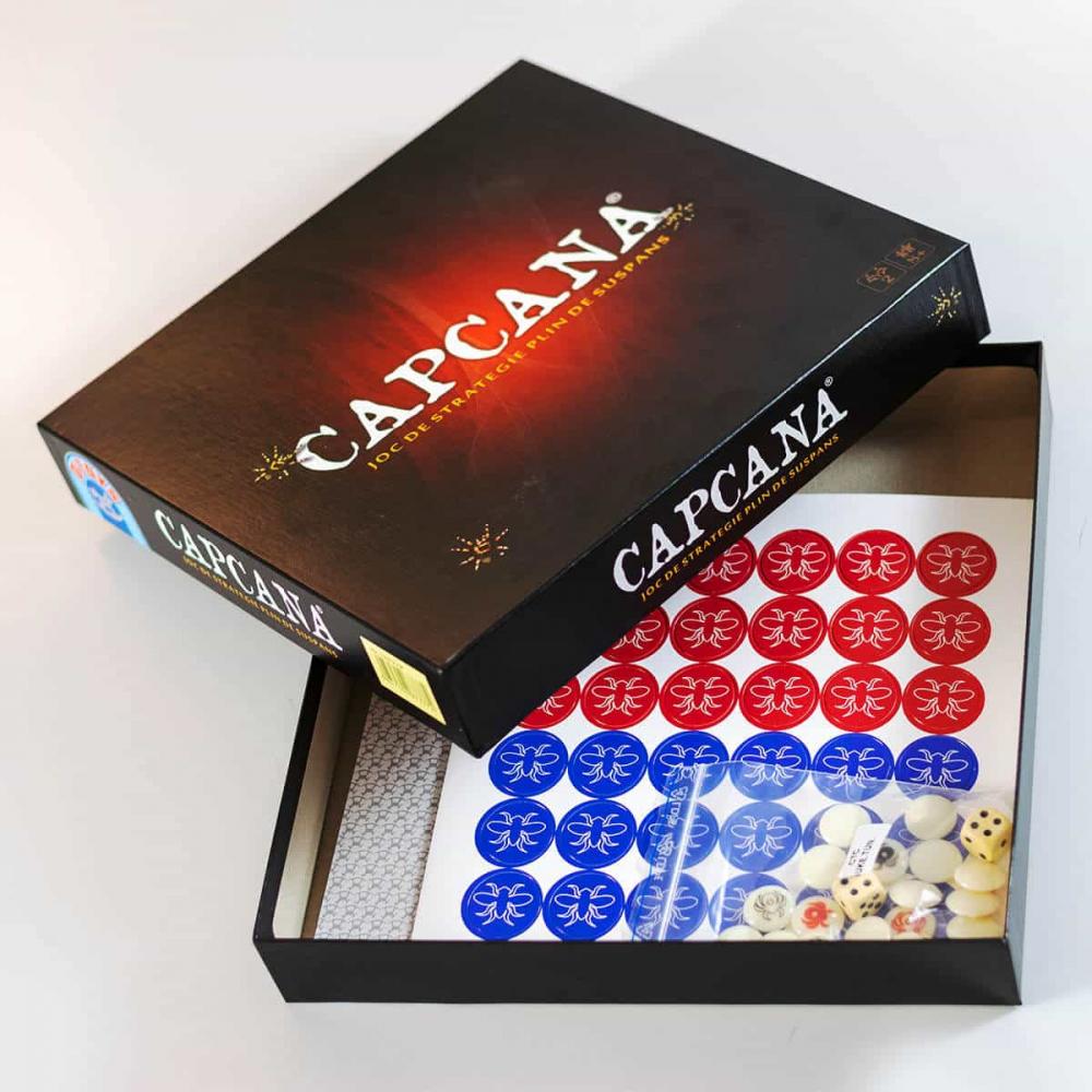 Jocul Capcana contine: 1 x Tabla de joc 18 x piese de joc paianjeni 36 x jetoane de joc din carton 2 x zaruri Regulament de joc.