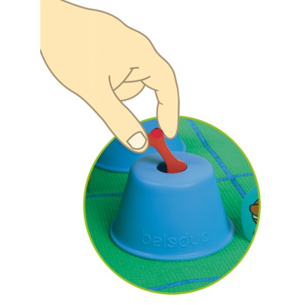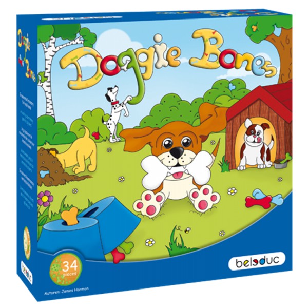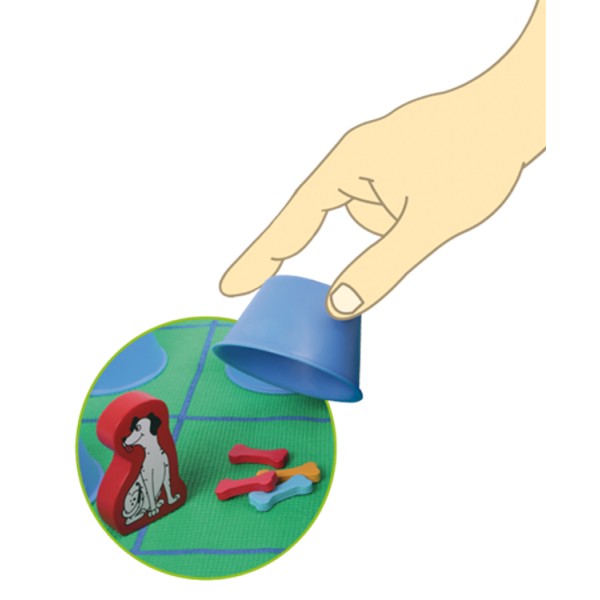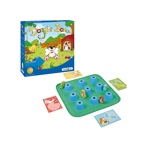 * Jocul contine: suportul pentru joc, 9 castronase, 16 oase (4 albastre, 4 rosii, 4 verzi si 4 galbene), 4 figurine catei si 4 carduri pentru depozitare.