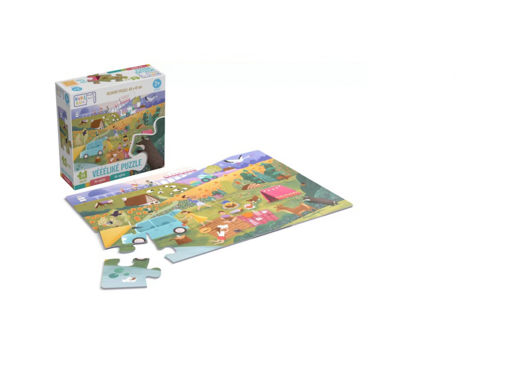 Joc educational pentru copii, tip puzzle On the trip cu 2 fete, KuKiKuk Efko, 24 piese mari, carton gros, animatii colorate haioase, o fata pentru colorat, dimensiune montare 68x47 cm, varsta 2-6 ani