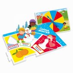 Jocul contine 1 tabla de joc cu 4 carti de puzzle, 12 cartele detasabile cu 12 luni, 1 copil pilot, 1 baza verde din plastic, 1 ruleta colorata, 4 planse cu fructe, 32 de planse pentru jocul de memorie si 1 ghid de instructiuni.