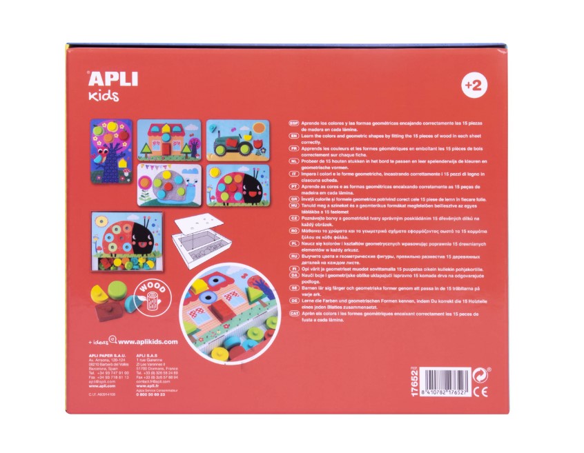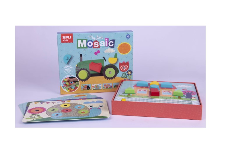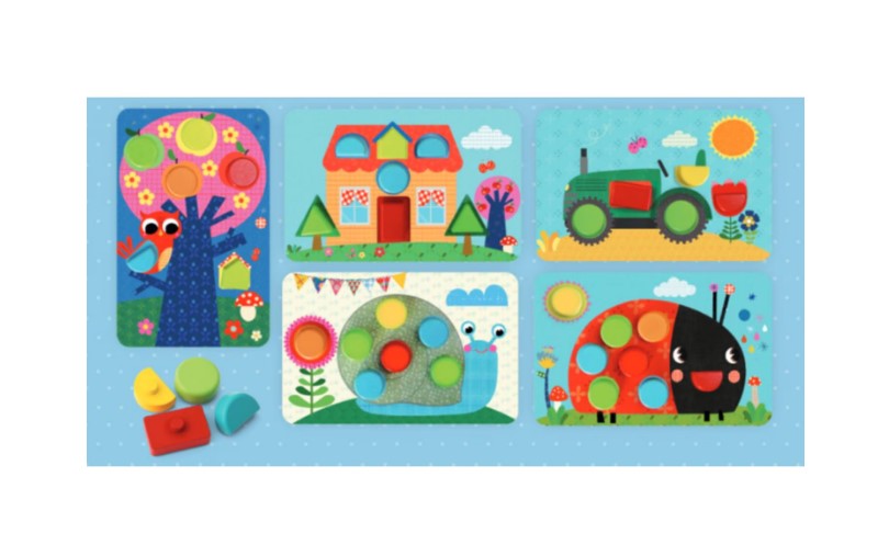 Mozaic din lemn cu 15 piese pentru a invata culorile si diferitele forme geometrice, prin montarea pieselor in diferite carti.