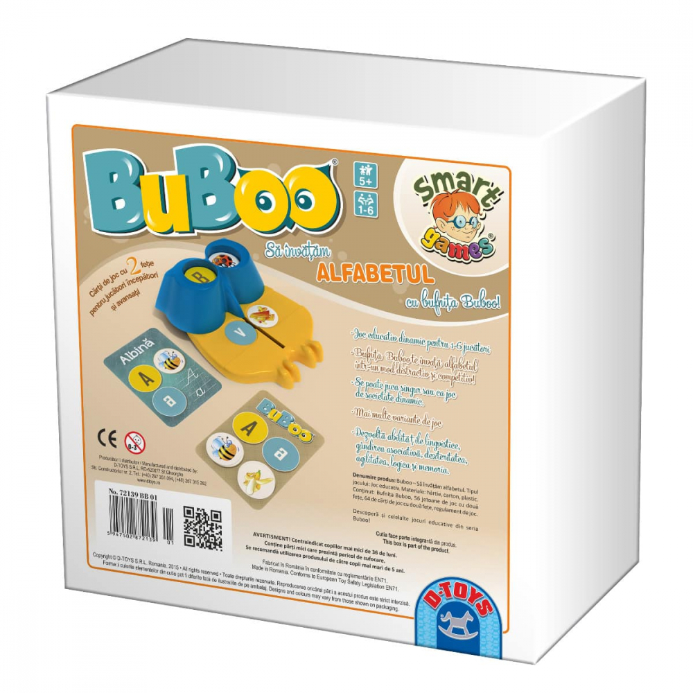Dacă ești în căutarea unui joc isteț din care copiii să învețe noțiuni de bază cum este alfabetul și cititul, dar care să fie amuzant și jucat de plăcere, atunci Jocul Buboo – Să Învățăm Alfabetul este alegerea perfectă. Spor la joacă alături de Buboo!