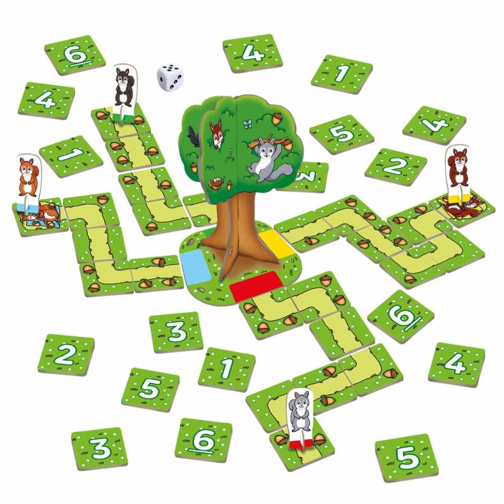 Continut:1 copac 3D format din două piese, 1 cartonaș bază pentru copac, 4 pioni 3D - veveriță, 4 suporturi pentru pioni, 4 cartonașe picnic, 36 de cartonașe drum, 1 zar, instructiuni
