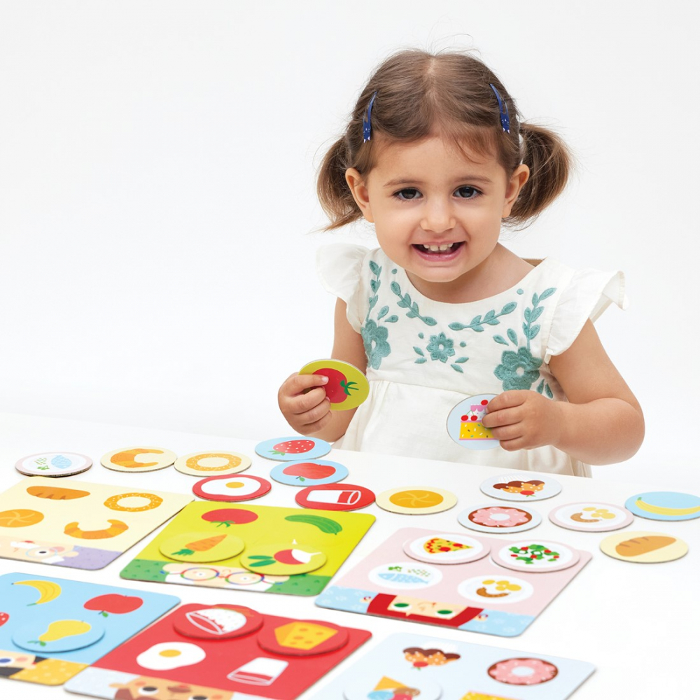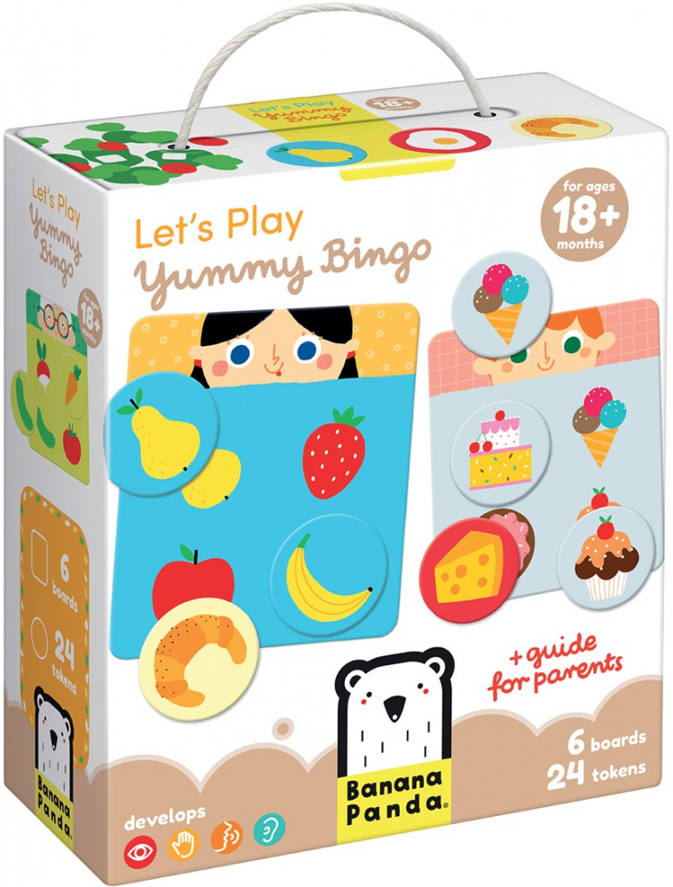 Joc educativ pentru copii tip Bingo si asociere imagini, Banana Panda Let's Play Yummy Bingo, cu alimente, 6 planse si 24 piese de asezat, varsta +18 luni.