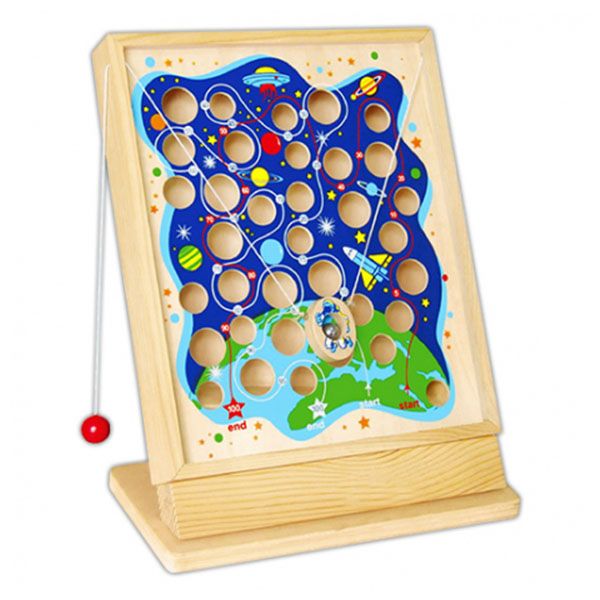 • Jocul din lemn cu bile Nava spatiala necesita multa concentrare si rabdare din partea celor mici. Tabla din lemn, care reprezinta spatiul, are peste 30 de gauri pe care copilul trebuie sa le evite, in incercarea de a parcurge traseul marcat.