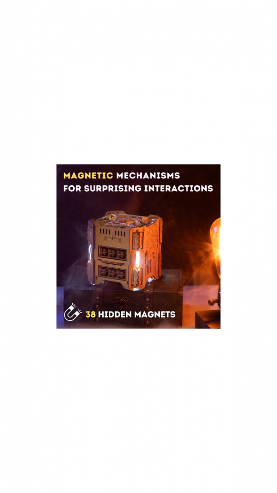 Construit cu atenție la detalii din placaj de mesteacăn, acril, oțel inoxidabil și componente electronice, acest puzzle îmbină meșteșugul tradițional cu misterul modern.