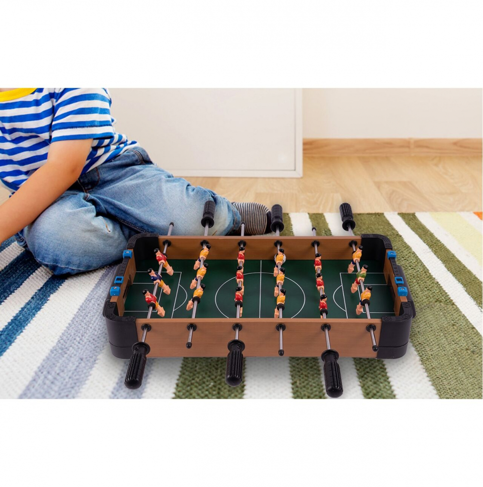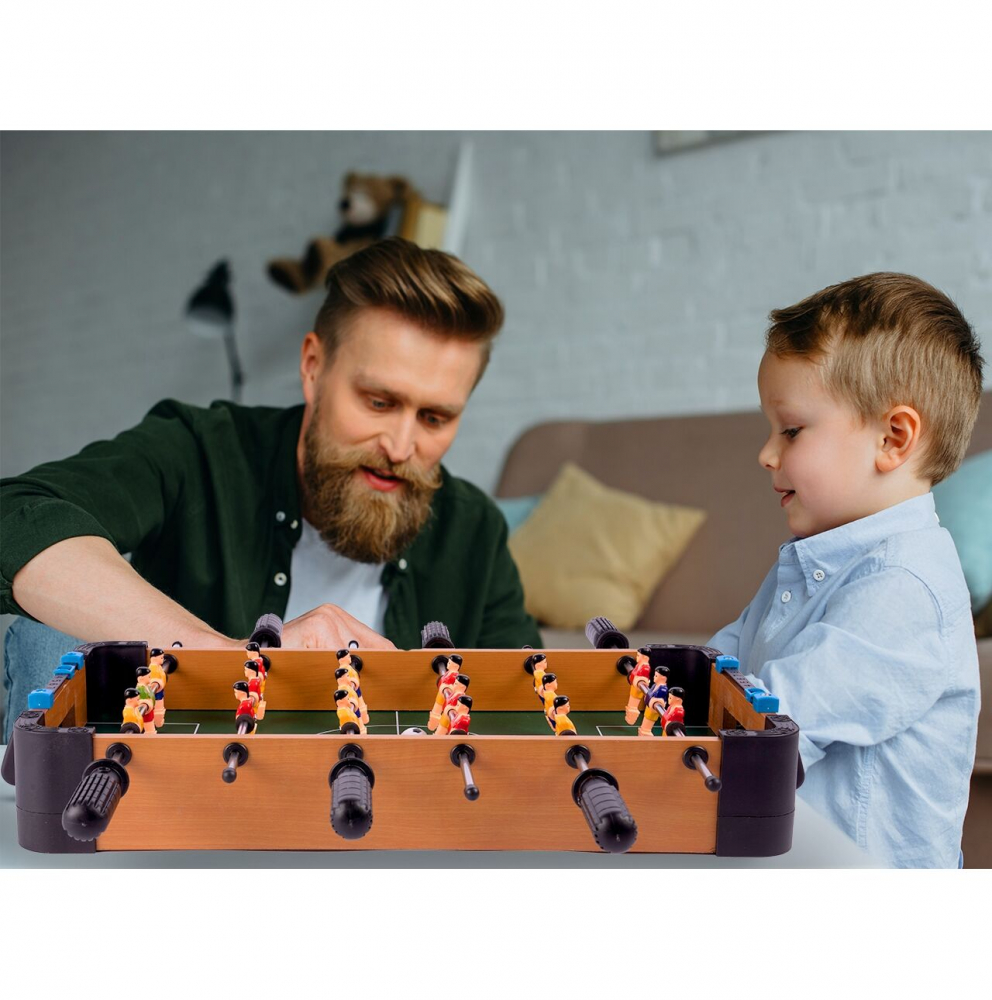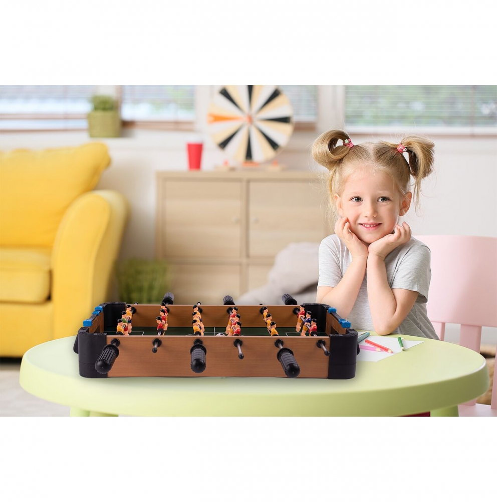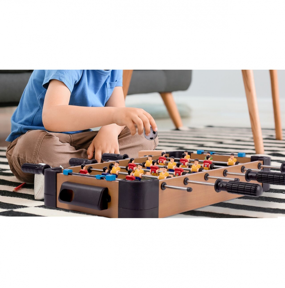 Joc fotbal de masa pentru copii, Malplay, realizat din lemn, cu jucatori plasati pe 6 pe tije metalice, 2 mingi incluse
