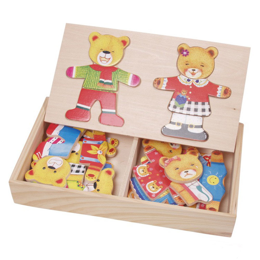 Un puzzle frumos din lemn ce infatiseaza doi ursuleti simpatici(fetita si baietel) care abia asteapta sa fie imbracati de catre micutul tau.