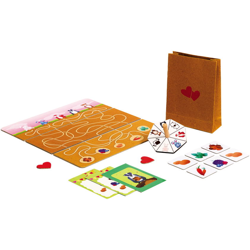 Setul include: 2 carduri cu animale cu model fata - verso, 2 carduri cu traseul din pamant cu model fata -verso, 2 carduri cu alimente cu model fata-verso,spinner, 20 de jetoane cu alimente, 8 carduri cu comenzi, 2 jetoane cu inimioare, o punga pentru alimente, instructiuni