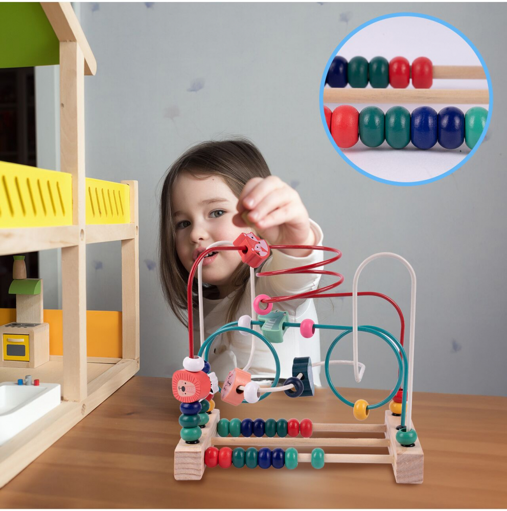Aventura cu margele: Cele 35 de margele colorate pot fi mutate de-a lungul traseelor, explorand diferite cai si dezvoltand coordonarea mana-ochi si motricitatea fina.