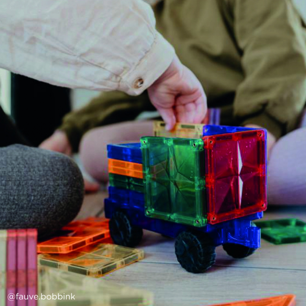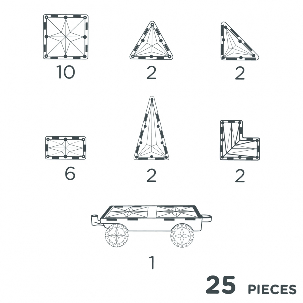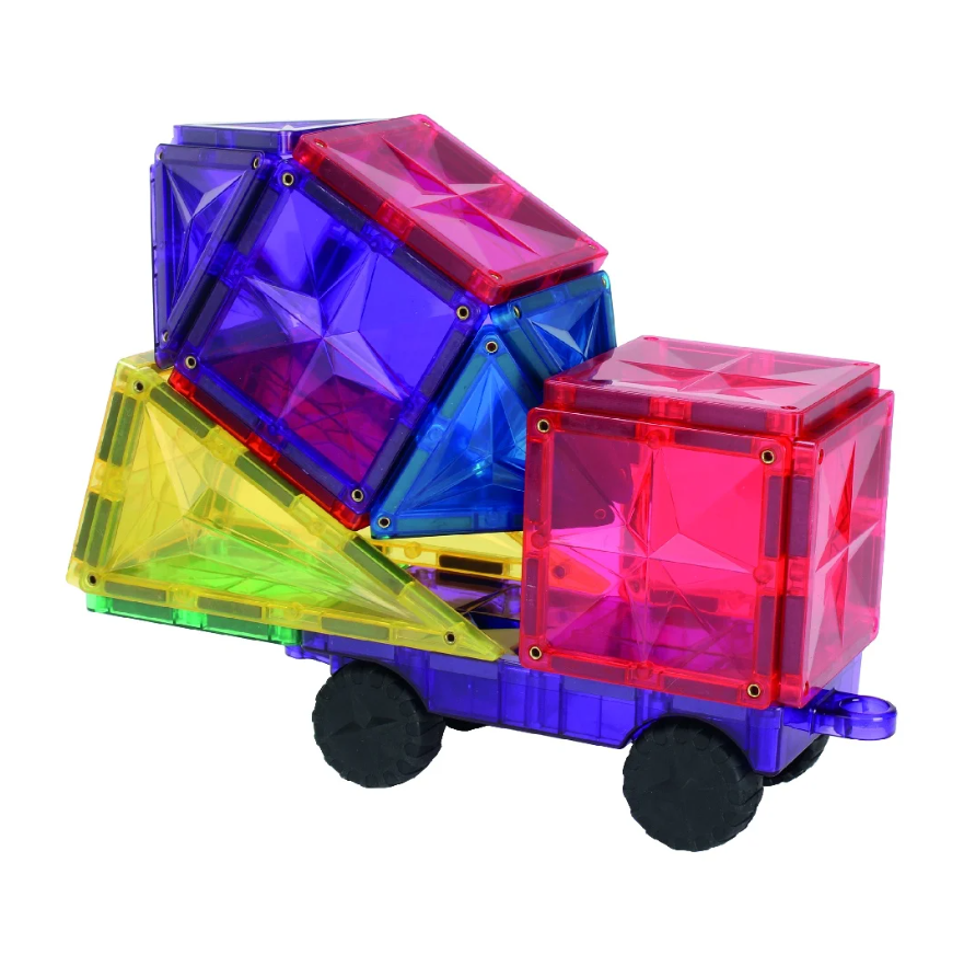Cu 25 de piese magnetice colorate, copilul poate explora diferite forme și își poate construi propria mașină de curse.