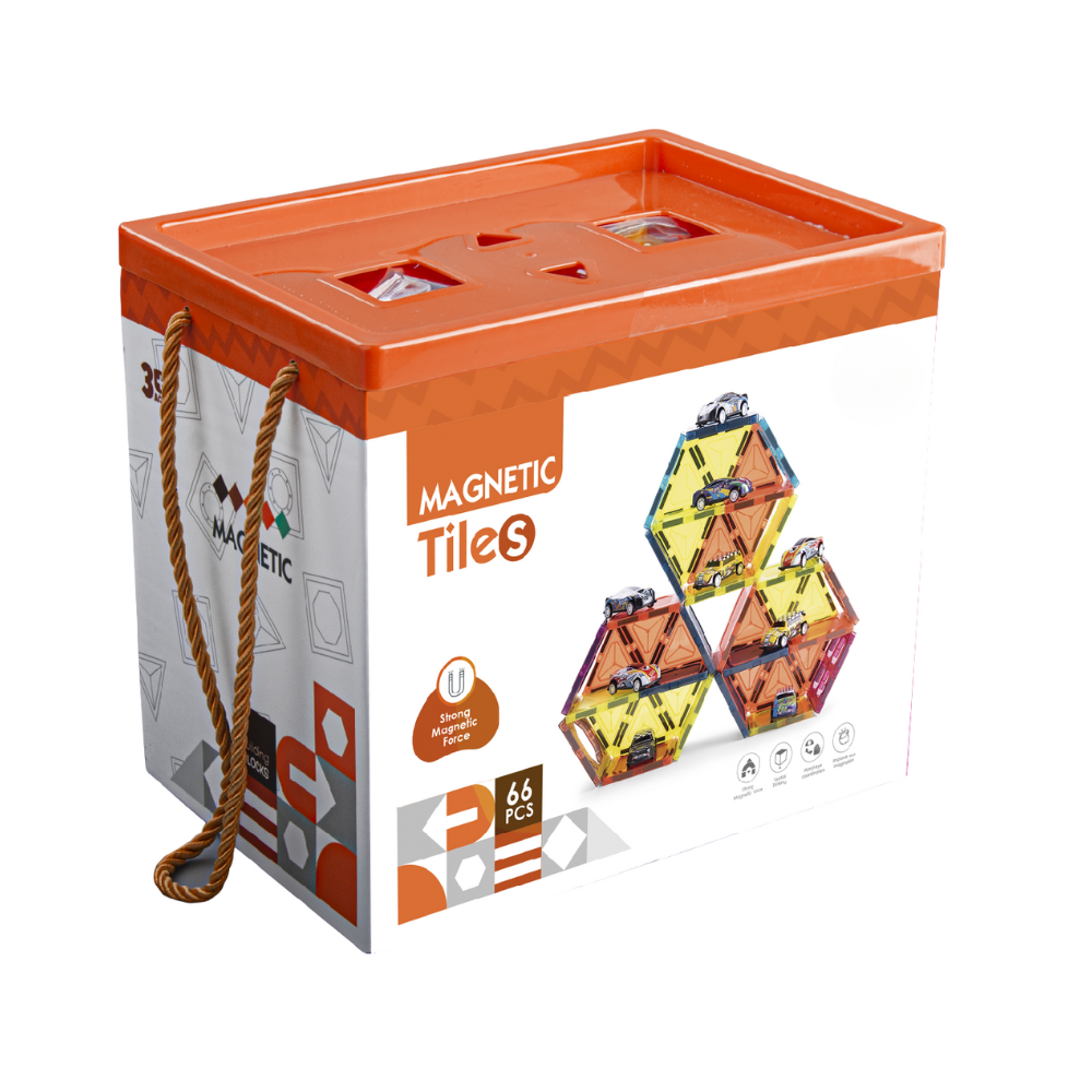 • 66 de piese in total: 56 piese magnetice din plastic durabil cu magnet integrat si 10 masinute simpatice, usor de manevrat de catre copii