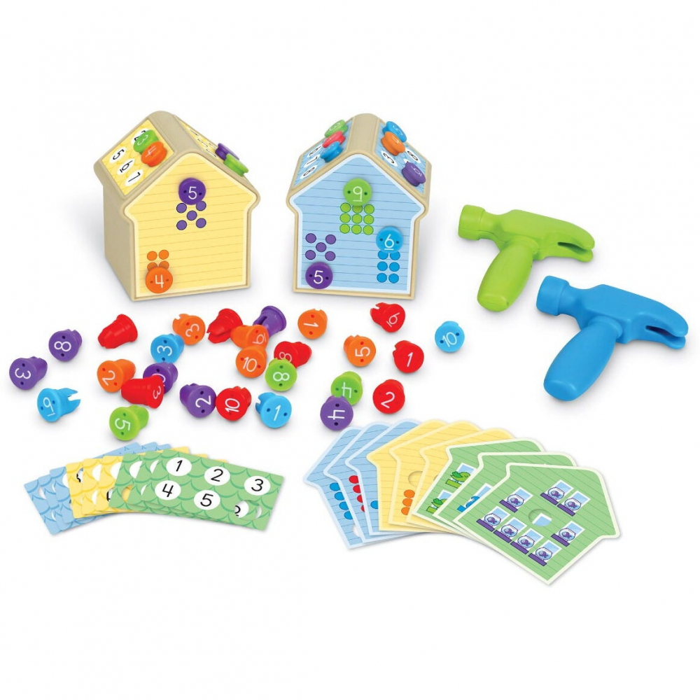 -setul contine tot ce este necesar pentru a incepe constructia: doua rame de casa, doua ciocane, 50 de cuie de plastic si 48 carduri cu numere