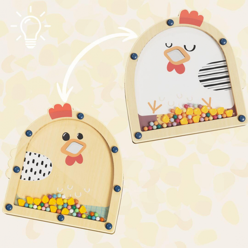 Construit sub forma unei gaini dragute, acest joc inovativ invita copiii sa participe la un joc de hranire, imbunatatind abilitatile motorii fine si coordonarea mana-ochi. Avand la baza principiile Montessori, acest joc este un instrument exceptional pentru invatare educationala si joaca senzoriala.