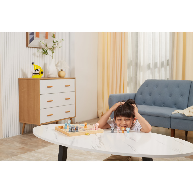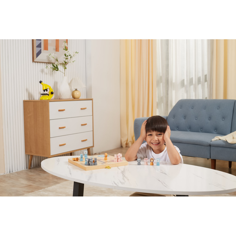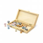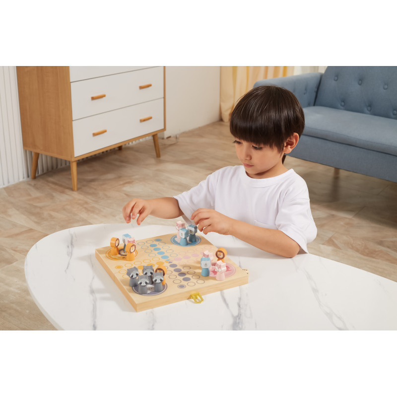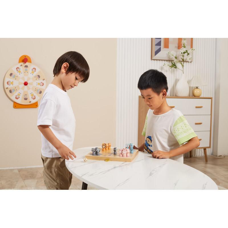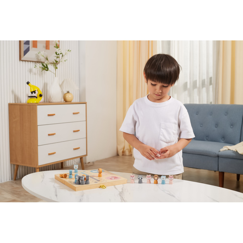 Vine cu 16 figurine din lemn (4 bucati din fiecare din cele 4 animale) si 4 zaruri.