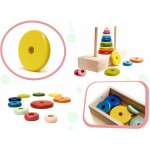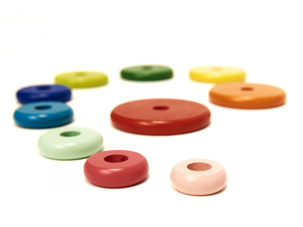 Plasarea discurilor pe tije ajuta la dezvoltarea abilitatilor manuale si a coordonarii „mana-ochi”.