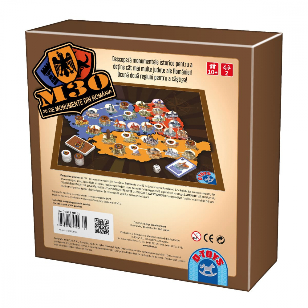 Cutia conține: 1 tablă de joc cu harta României, 32 cărți de joc cu monumente, 49 jetoane de joc, 1 zar, 2 pioni, regulament de joc.