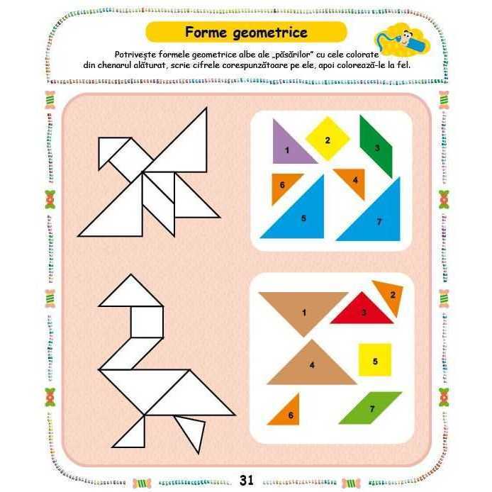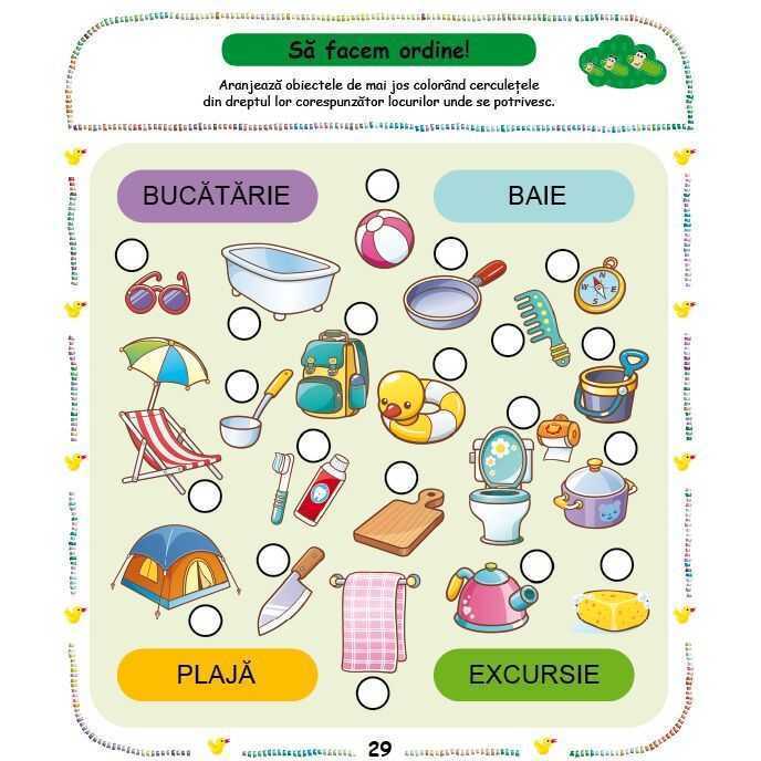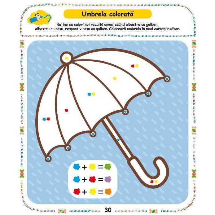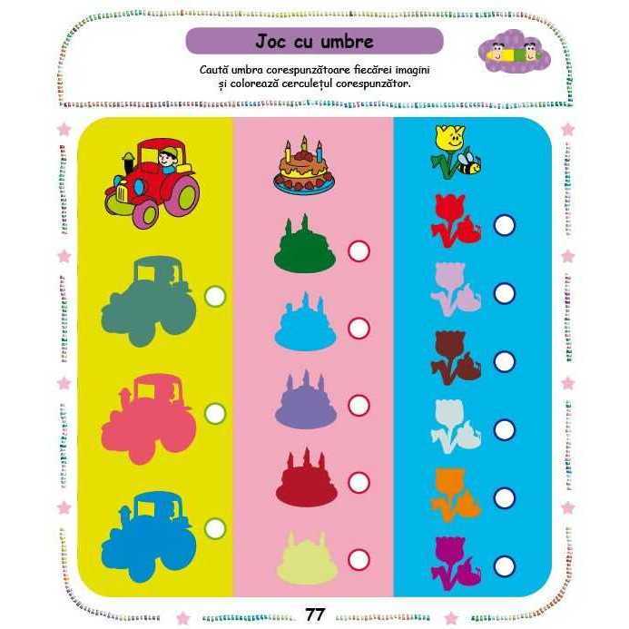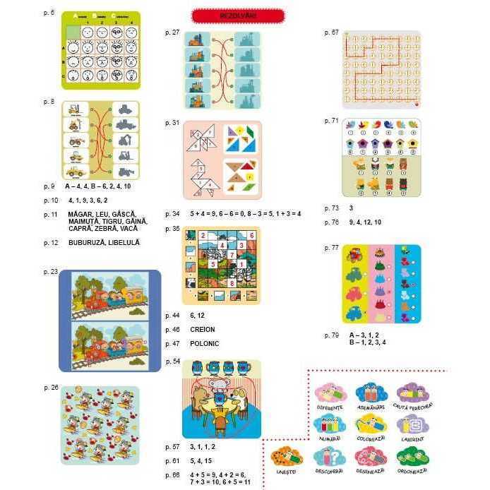 Acest caiet te ajuta sa numeri, sa calculezi, sa grupezi/ordonezi, sa faci asocieri, sa rezolvi labirinturi, sa gasesti diferente si asemanari, sa desenezi, sa unesti puncte, sa colorezi.