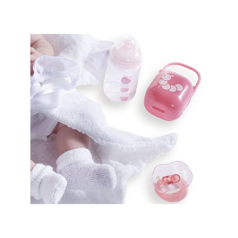 Jucarie bebelus 39 cm cu trusou alb si suzeta cu etui si biberon