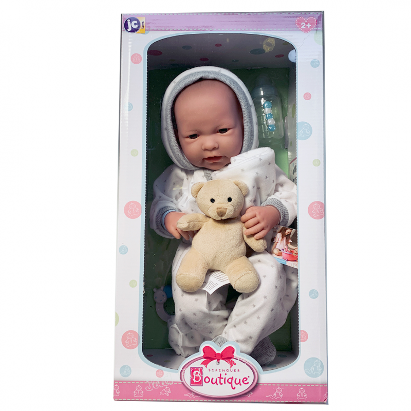 Jucarie Bebe fetita 43 cm costum vara roz si paturica este o jucarie foarte bine realizata, ideala pentru orice copil datorita design-ului care pune accent mai ales pe siguranta. Vinilul fin din care este confectionata aceasta papusa, este foarte rezistent la loviturile si zgarieturile ce pot aparea in timpul jocului. Dragalasa papusa baietel are un costumas cu gluga alb cu stelute gri, o paturica in aceeasi tematica, o jucarie pentru dentitie cu zornaitoare, un ursulet din plus cu zornaitoare, un certificat de nastere in care ii poti scrie numele, greutatea si alte detalii, bratara de la maternitate, suzeta si un biberon. Expresia de pe fata bebelusului este incantatoare, aducand un zambet oricarei persoane care il priveste.