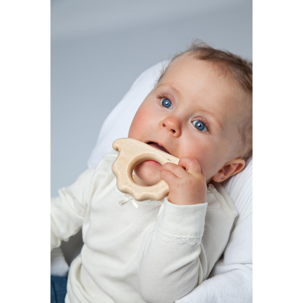 Pur si simplu puneti jucaria din lemn in mana bebelusului, astfel incat acesta sa se poata juca cu ea.