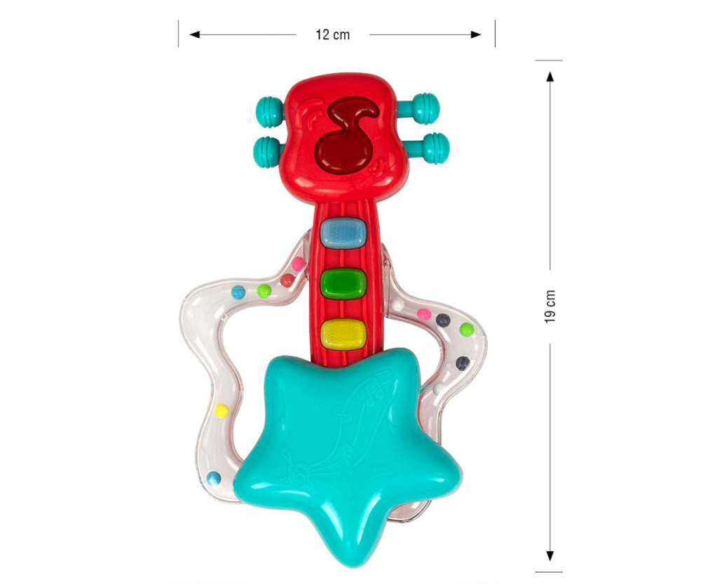 Pe gatul chitarei sunt 3 butoane muzicale, care ar trebui sa modeleze curiozitatea copilului. Este o jucarie cu zdranitoare care ii stimuleaza simturile, ceea ce este important in primele etape ale dezvoltarii copilului