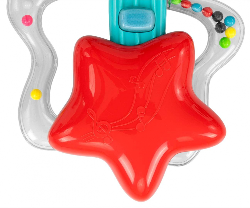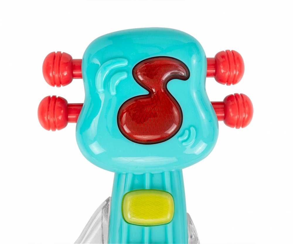 Pe gatul chitarei sunt 3 butoane muzicale, care ar trebui sa modeleze curiozitatea copilului. Este o jucarie cu zdranitoare care ii stimuleaza simturile, ceea ce este important in primele etape ale dezvoltarii copilului