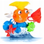 * apa care curge prin gaurile jucariei se revarsa peste elementele sale, punand clestele, ochii, stelele de mare si o floare cu un peste in miscare
