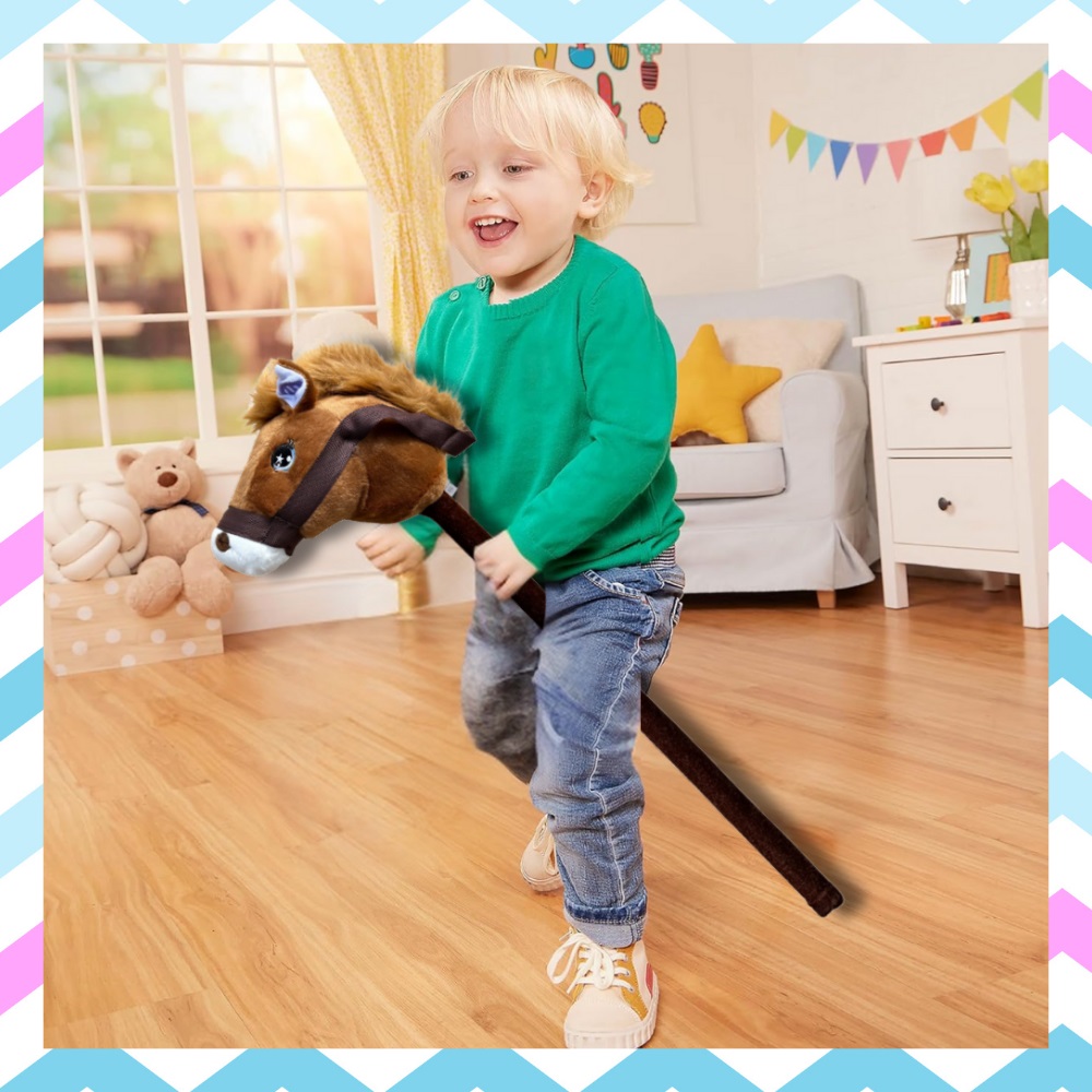 Jucarie de calarit pentru copii, NiceKids Brown Horse, Cap de calut plusat pe tija, cu sunete, dimensiune 85 x 20 cm